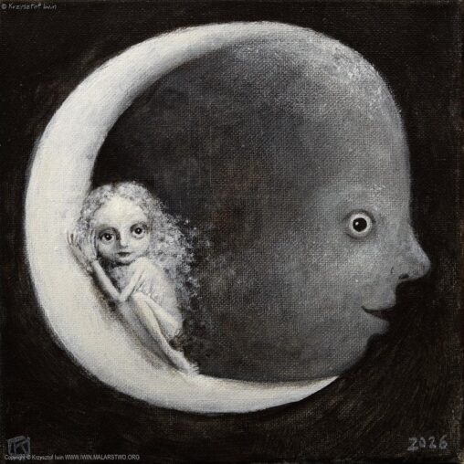 Krzysztof Iwin – „Księżycowe dziecko” akryl, płótno 20x20cm (2026) https://iwin.malarstwo.org/pl/ksiezycowe_dziecko-2539.html #księżyc #ilustracyjne #dziecko #20cm #20cm #2026r #biele #czernie #szarości #art #painting #Iwin #KrzysztofIwin #obrazy #galeria #malarstwo #akrylenaplotnie #obrazyakrylowe