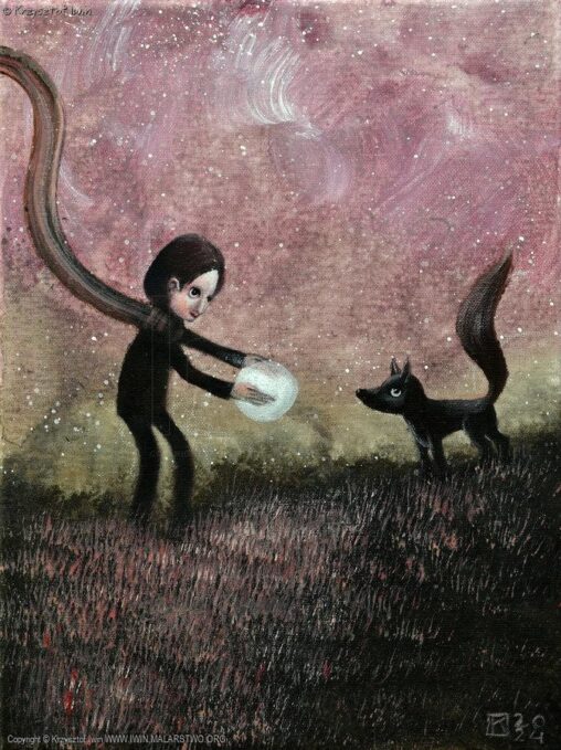 Krzysztof Iwin – „Spotkanie z metafizycznym lisem” akryl, płótno 30x40cm (2024) https://iwin.malarstwo.org/pl/spotkanie_z_metafizycznym_lisem-2361.html #ilustracja #baśniowe #lis #chłopiec #księżyc #30cm #40cm #2024r #biele #czernie #szarości #róże #art #painting #Iwin #KrzysztofIwin…